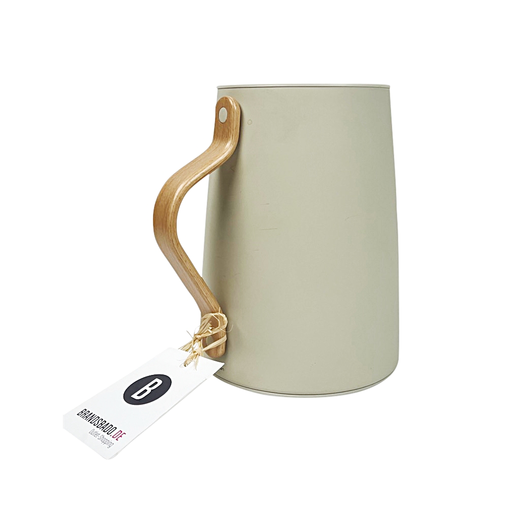 Teezubereiter Emma von Stelton. Variante ist in Beige/matt. Fassungsvermögen ist ca. 1 L. Material vom Korpus ist Edelstahl, beschichtet. Der Griff ist aus Buchenholz.