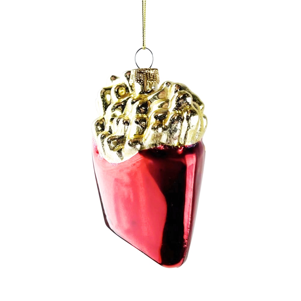 Glas-Baumanhänger "Fries" von HD Collection. Das Material ist Glas und Metall. Die Maße sind ca. Breite 9 cm. Die Höhe beträgt ca. 11 cm. Die Tiefe ist ca. 6 cm. Die Farben sind Rot und Gold.