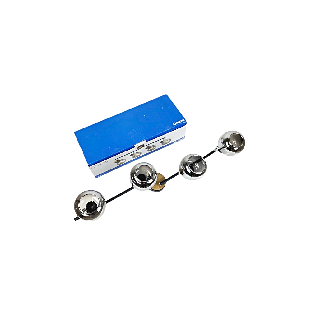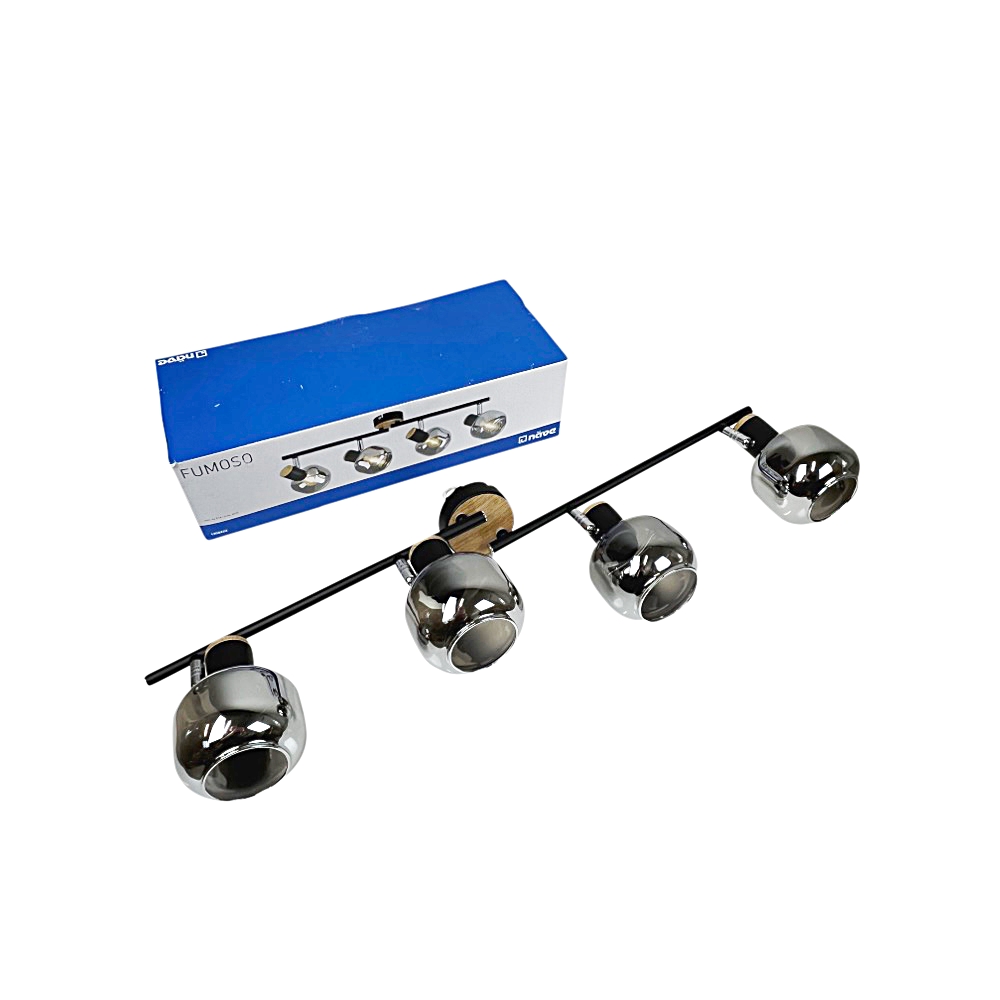 Deckenleuchte Fumoso von Näve. Material ist Metall, Glas. Maße sind ca. B 58 cm, H 16 cm, T 18 cm. Die 4 Spots lassen sich ausrichten. Tolles Design mit schicken Glaskolben. Die Fassung ist 4x E14, 40 Watt. Die benötigten Leuchtmittel sind nicht enthalten. Der Durchmesser eines Spots ist ca. 9 cm.